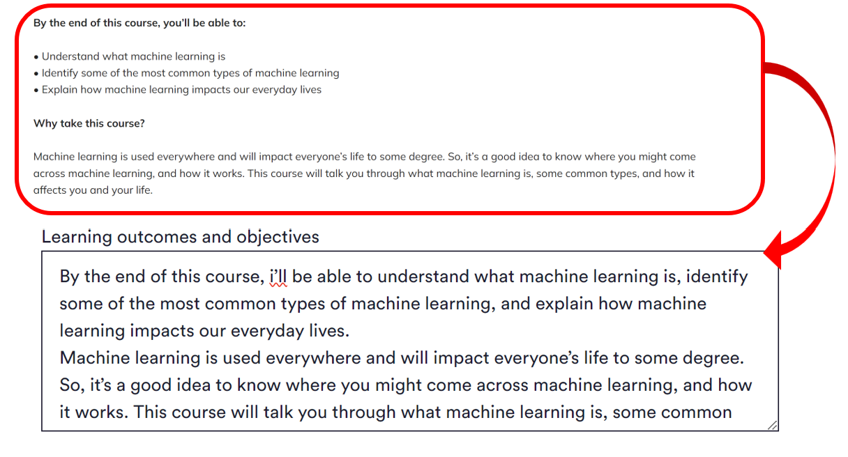 - Learning outcomes and objectives can refer from our course description from “By the end of this course, you’ll be able to:” as the learning outcomes, and “Why take this course?” as the objectives