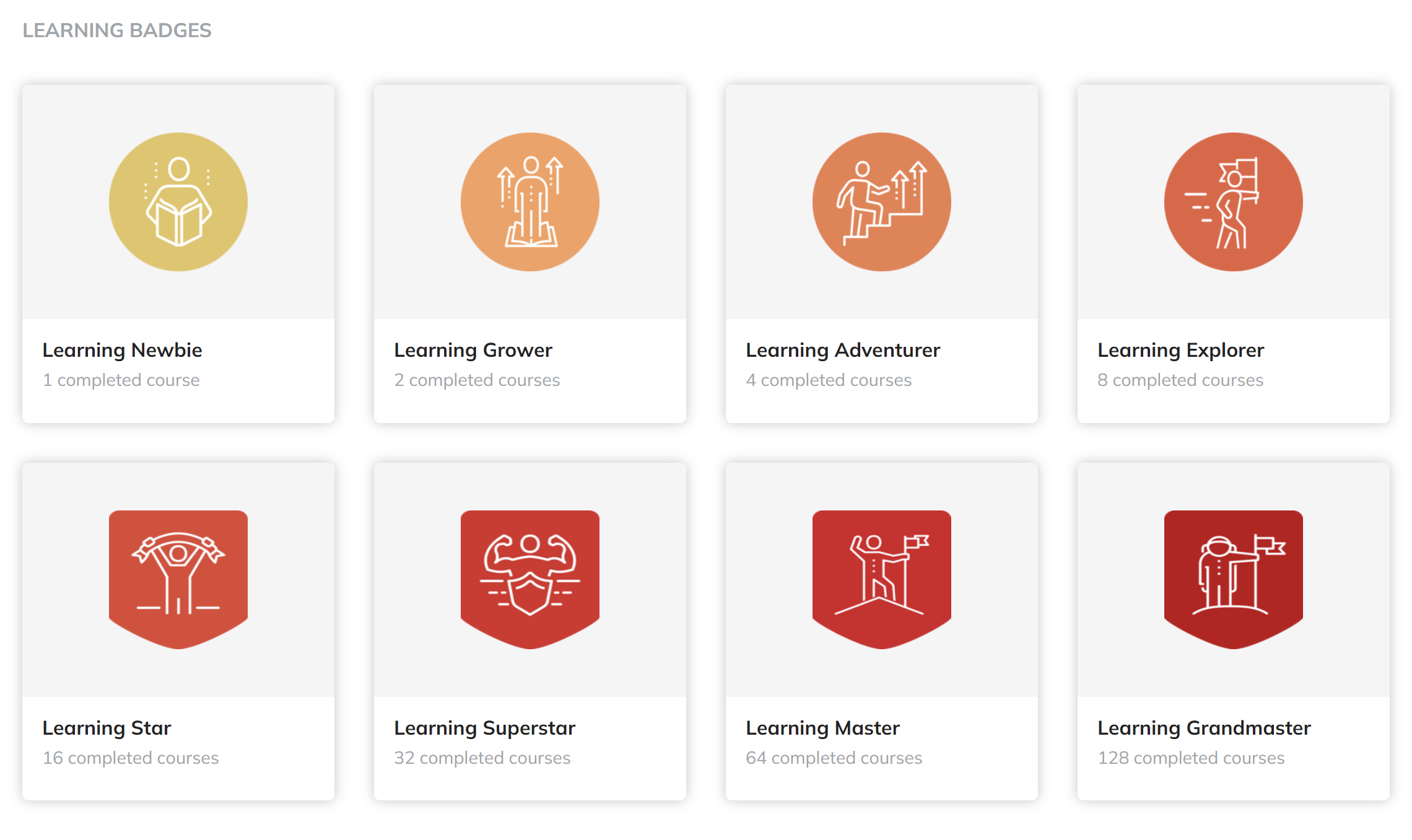 Learning Badges: Based on the number of courses completed (e.g., 1, 2, 4, 8, 16, 32, 64, 128 completed courses). Orange, representing growth and curiosity.