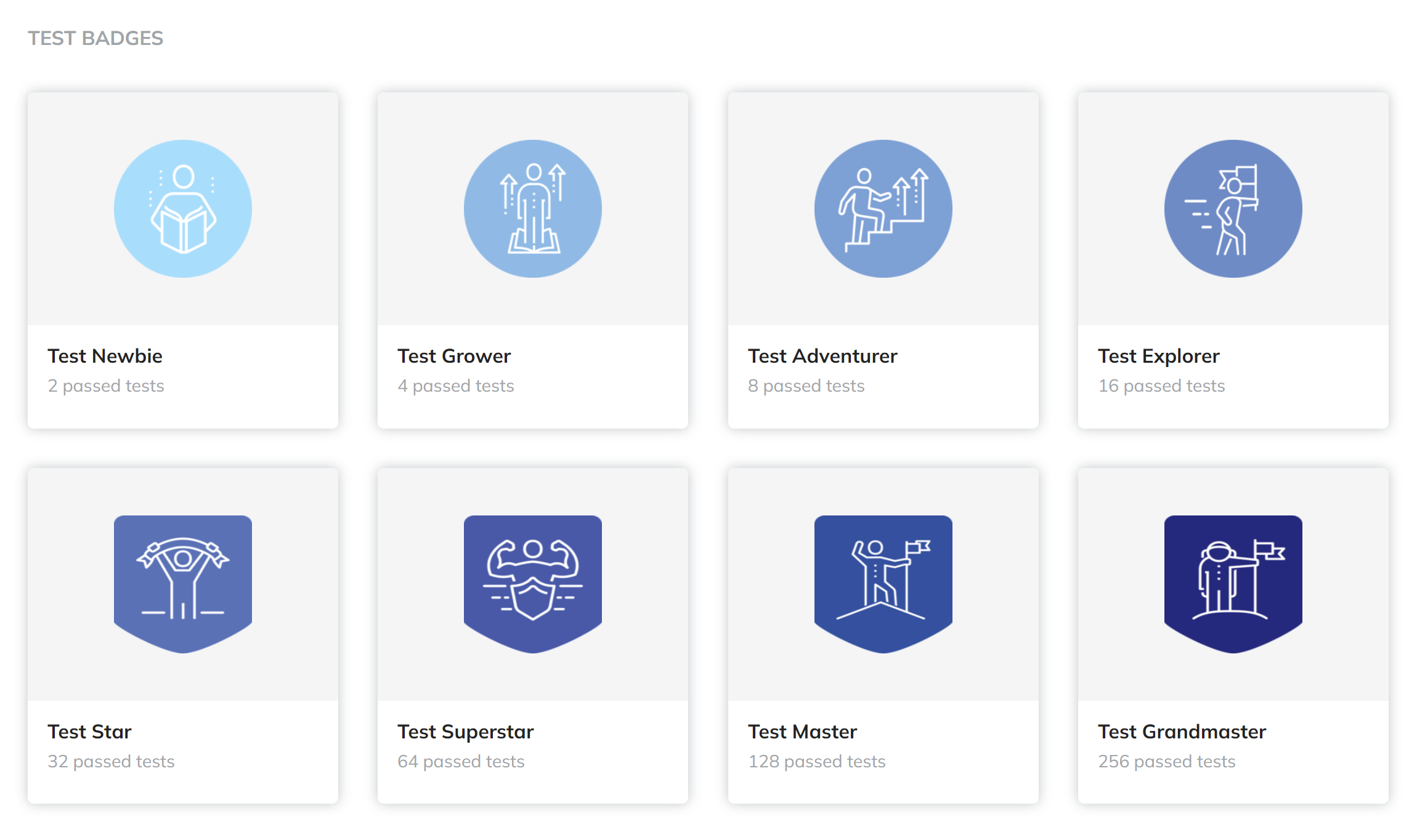 Test Badges: For completing tests (e.g., 2, 4, 8, 16, 32, 64, 128, 256 passed tests). Sky blue, symbolizing knowledge and understanding.