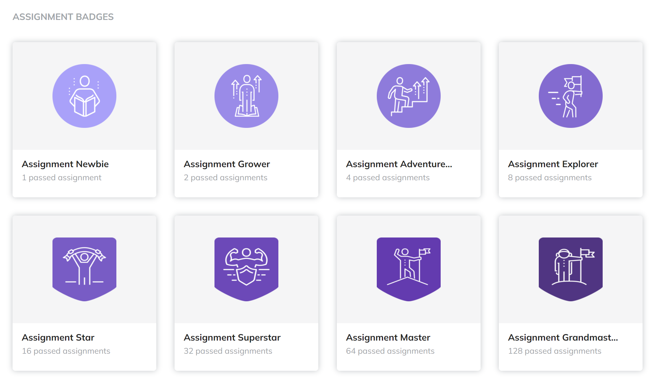 Assignment Badges: Earned when you pass assignments (e.g., 1, 2, 4, 8, 16, 32, 64, 128 passed assignments). Purple, representing creativity and effort.