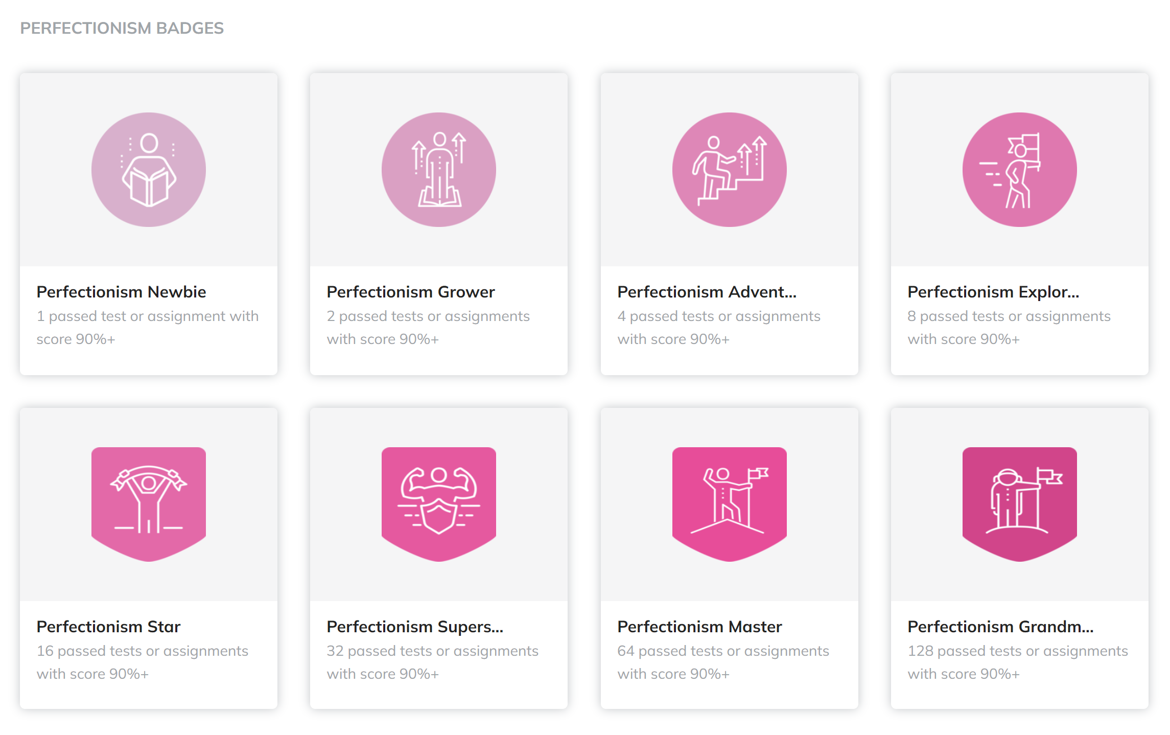 Perfectionism Badges: For scoring 90% or higher on tests or assignments (e.g., 1, 2, 4, 8, 16, 32, 64, 128 tests or assignments with a score of 90%+). Pink, reflecting excellence and attention to detail.