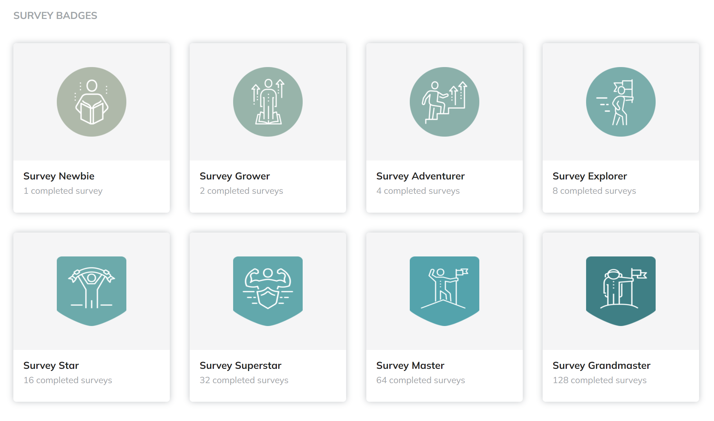 Survey Badges: Earned by completing surveys (e.g., 1, 2, 4, 8, 16, 32, 64, 128 completed surveys). Green, symbolizing feedback and contribution to the community.