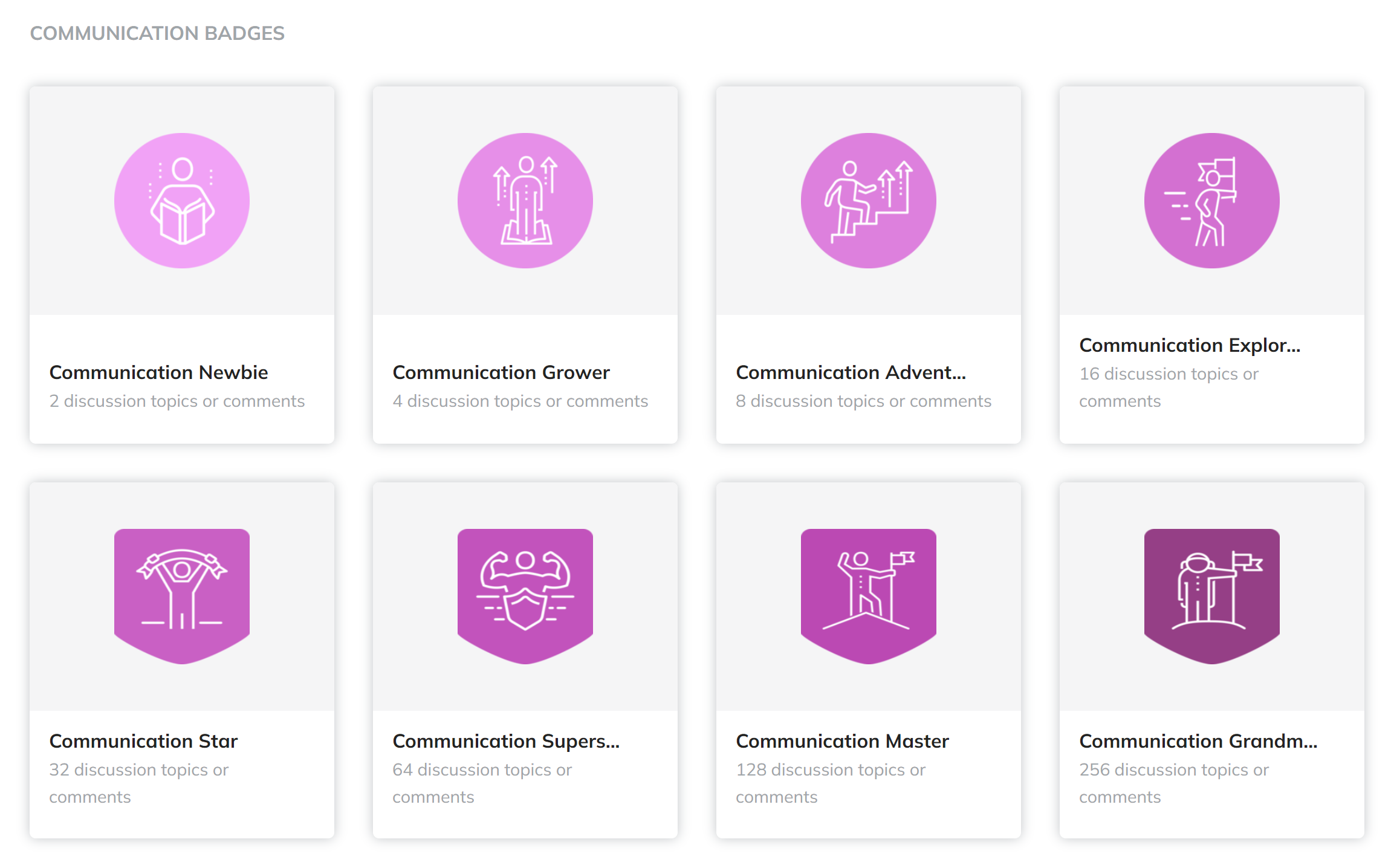 Communication Badges: Earned for participating in discussions (e.g., 2, 4, 8, 16, 32, 64, 128, 256 discussion topics or comments). Magenta, representing interaction and engagement.