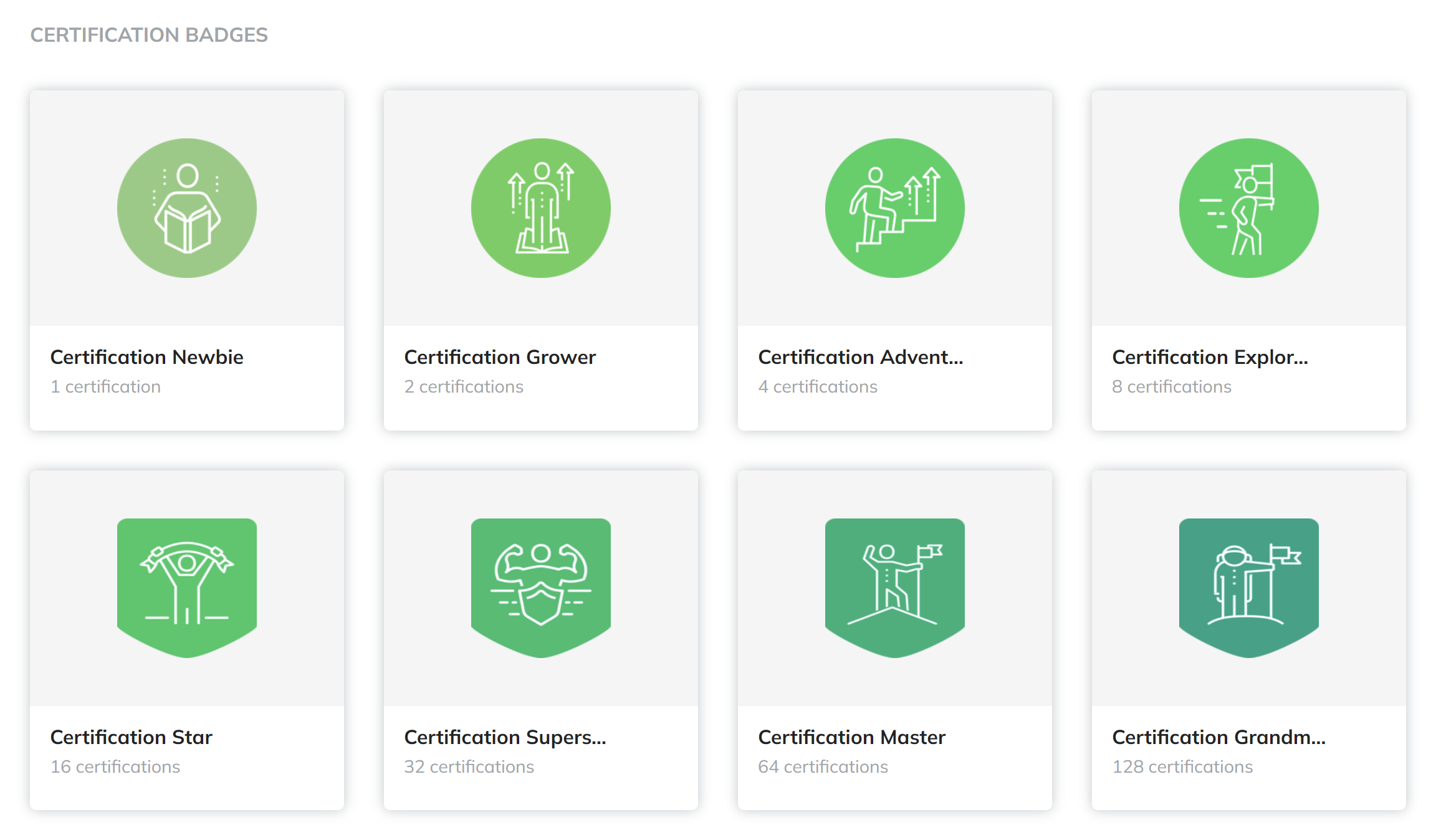 Certification Badges: For achieving certifications (e.g., 1, 2, 4, 8, 16, 32, 64, 128 certifications). Lime green, representing skill mastery and achievement.