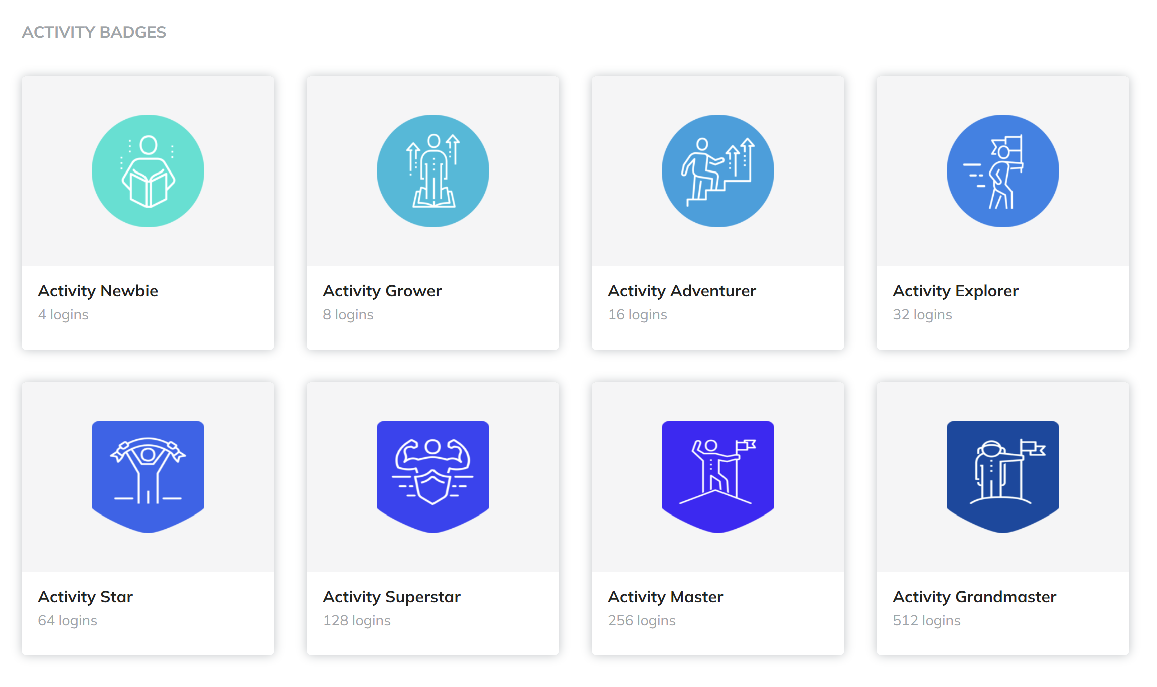 Activity Badges: For logging in multiple times (e.g., 4, 8, 16, 32, 64, 128, 256, 512 logins). Light blue, symbolizing consistency and commitment.